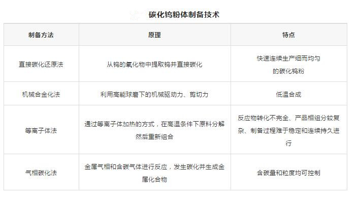 碳化鎢粉體一般的制備方法是碳熱還原法,但是這種方法有局限性,所制造的碳化鎢粉體為微米級(jí)的,不能進(jìn)一步細(xì)化。近年來,碳化鎢粉體制備技術(shù)得到了充分的研究和開發(fā),許多納米級(jí)粉體的制備技術(shù)被應(yīng)用,如直接還原碳化技術(shù)、等離子體法、機(jī)械合金化技術(shù)、氣相碳化法等。