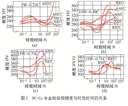 WC-Co合金時效時因有 Co3WCX和接近于Co3WCX致密組織相析出,因此合金的硬度會提高,但在隨后轉變?yōu)镃o3W析出時合金的硬度則會降低。H·Jonsson實驗資料如圖5、圖6所示。