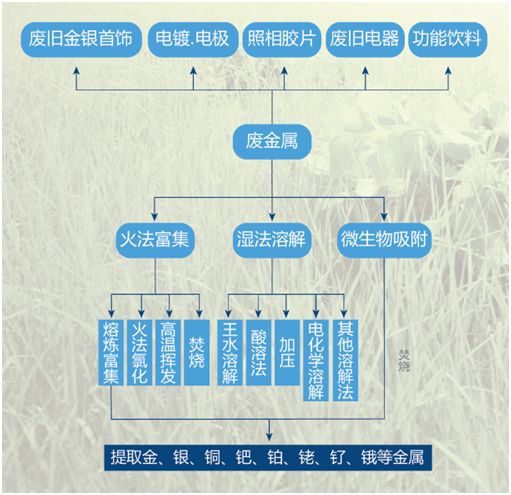 廢舊金屬主要通過火法富集、濕法溶解、微生物吸附等工藝實(shí)現(xiàn)資源回收利用,既減少對(duì)自然環(huán)境的破壞,又降低金屬冶煉成本。具體見下圖: